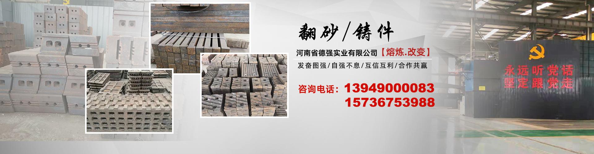 河南省德強(qiáng)實(shí)業(yè)有限公司專(zhuān)業(yè)鑄造板錘、高鉻板錘、破碎機(jī)板錘、反擊破板錘、細(xì)碎機(jī)錘頭、制砂機(jī)錘頭、粉碎機(jī)錘頭、球磨機(jī)襯板、鋼球、鋼段、顎式破碎機(jī)鄂板(牙板、齒板),邊護(hù)板(叉板)、肘板、對(duì)輥破碎機(jī)(雙輥破碎機(jī))輥皮、輥殼、雷蒙磨配件(磨輥磨環(huán))等礦山配件,還可根據(jù)客戶(hù)需要定制各種耐磨鑄件,鑄鋼件,灰鐵鑄件、生鐵鑄件歡迎來(lái)電來(lái)函咨詢(xún)! 我廠(chǎng)生產(chǎn)的板錘、錘頭、球磨機(jī)襯板、鋼球、鋼段、顎式破碎機(jī)鄂板(牙板、齒板),邊護(hù)板(叉板)、肘板、對(duì)輥破碎機(jī)(雙輥破碎機(jī))輥皮、輥殼、襯板、雷蒙磨配件磨輥磨環(huán)等礦山配件,廣泛用于冶金、建材、礦山、電力、化工行業(yè)。其中采用的雙金屬材料連續(xù)澆注一次鑄造成型技術(shù),替代現(xiàn)有市場(chǎng)上錘柄、錘頭二次鑄造的工藝,使錘柄錘頭不斷裂。